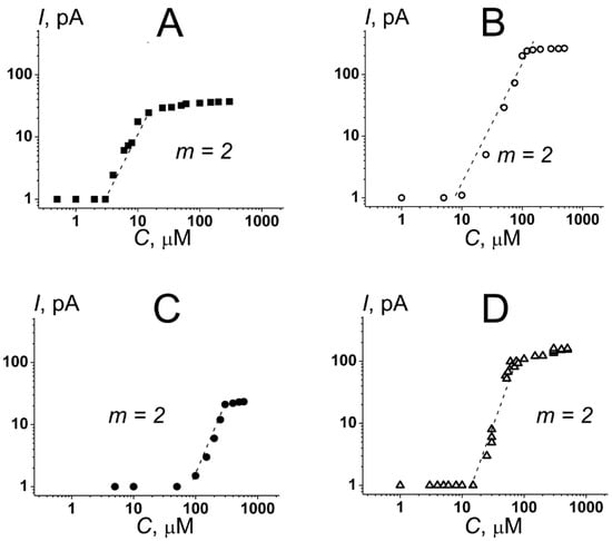 Dependence of the steady-state nisin-induced transmembrane current on the concentration of the lantibiotic in bilogarithmic coordinates. The membranes were made from (A) DOPC/DOPG (50/50 mol%), (B) DOPC/TOCL (50/50 mol%), (C) DOPE/DOPG (50/50 mol%), and (D) DOPE/TOCL (50/50 mol%) and bathed in 0.1 M KCl, pH 7.4. V = 100 mV. The slope (m) of the linear function fitting the growth region of the dependence characterizes the number of nisin molecules involved in the pore formation in membrane of appropriate composition.