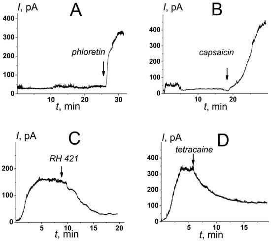 Figure 3 demonstrates the effects of various small molecules, 20 μM phloretin, 400 μM capsaicin, 5 μM RH 421, and 500 μM tetracaine, on the macroscopic conductance induced by nisin in the DOPC/TOCL (50/50 mol%) membranes. Table 2 summarized the mean ratios between the nisin-induced steady-state transmembrane currents in the presence and absence of the tested compounds (Iagent/I0control). Phloretin and capsaicin led to a 5- and 11-fold increase in the steady-state nisin-induced transmembrane current, respectively (Figure 3A,B and Table 2), while the introduction of RH 421 and tetracaine caused 1.5–2-times decrease in the steady-state lantibiotic-induced transmembrane current (Figure 3C,D and Table 2). Significant correlation between Iagent/I0control and Δφb-values was observed (the correlation coefficient by Pearson was equal to 0.74). Therefore, we concluded that the changes in the bilayer boundary potential due to the adsorption of the small molecules (due to the changes in its surface or dipole component) can modulate nisin pore-forming activity in the cardiolipin-enriched bilayers. Thus, the compounds diminishing the membrane boundary or dipole potential (in particular, phloretin and capsaicin) might be considered as potentiators of the anticancer action of nisin.