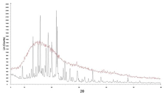 X-ray diffraction patterns of pure CYT (black) and Film B (red) reported as a representative example for all the prepared film.