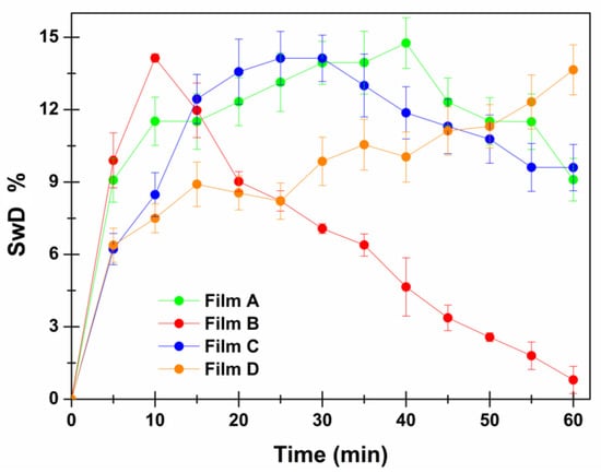 Swelling Degree % as a function of time (min) for Film A (green), Film B (red), Film C (blue), Film D (orange). Data are reported as means ± SE (n = 3).