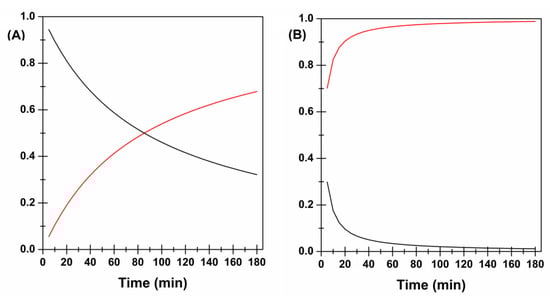 Diffusion (F–black) and Relaxation (R-red) contributions in the CYT release process from Film B (A) and Film C (B) as a function of time.