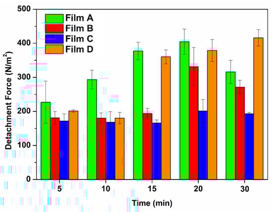 Detachment Force (N/m2) as function of the contact preload time (min) with the buccal mucosa when evaluating Film A (green), Film B (red), Film C (blue), Film D (orange). Values are presented as means ± SE (n = 3).
