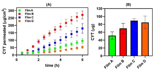 (A) CYT (mg/cm2) permeated as a function of time (h). (B) Amount (μg) of CYT accumulated into the buccal membrane (0.636 cm2) after 6 h of experiment applying Film A (green), Film B (red), Film C (blue) and Film D (orange). Results are presented as means ± SE (n = 6).