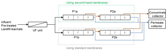 Compared to seawater (SW) desalination facilities, LFL plants host a relatively small number of membranes (generally <200 RO modules). On-site treatment costs using RO membranes range from 15€·m−3 to 40€·m−3 [1]. However, the complexity of the LFL composition limits the spiral-wound RO membrane lifespan up to 3 years. The need of frequent replacement is an economical and environmental issue concerning industry, which normally pays between 500€ and 1000€ for a single spiral wound RO module (data based on interviews of membrane operators), and generally disposes of the end-of-life membranes in landfills [21]. In fact, by 2025, around two million end-of-life RO membranes per year will be discarded from industrial processes (i.e., desalination) [22]. Indiscriminately, membrane landfill disposal is relatively cheap (less than 10€/end-of-life membrane [21]), but is against sustainability and circular economy. Although, in the last two decades many studies have been pointing out the possibility of RO membrane recycling and reuse, as summarized on the REMapp website [23], so far most of the attempts have been only focused at laboratory [24,25,26,27] or pilot scale [28,29,30].