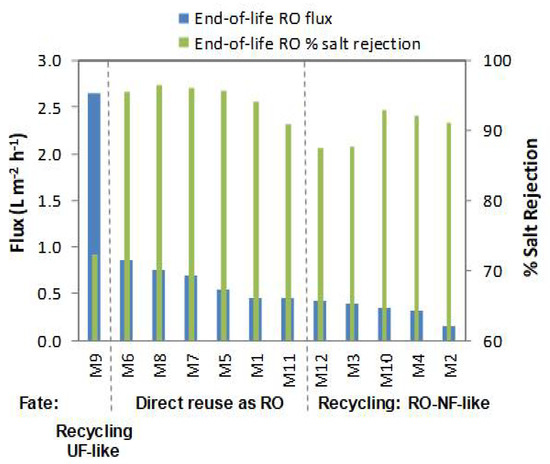 Table 6 shows permeate flux, permeability and the rejection coefficients when treating the pre-filtered LFL water, compared to the observed rejection at the industrial facility prior to installing any second-hand membranes (based on historic data 2016–2019 and a punctual sample of July 2019).
