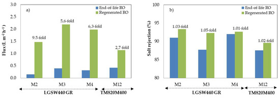 Figure 3 shows end-of-life RO membrane fluxes and rejection coefficients before and after being exposed to the regenerating solution. After chemical exposure, membrane flux increased substantially, i.e., up to 9.5-fold (M2). Positively also, the rejection capability did not vary or slightly increased. On one hand, membrane permeability increases due to fouling elimination. On the other hand, once fouling is eliminated, the components of the regeneration solution could potentially interact with the highly reactive end amine groups of the PA RO layer, and the carboxylic group (R-COOH) could turn to (R-COO-) groups in the linear part of cross-linked aromatic PA [32,33]. Therefore, the hydrophilicity of the membrane surfaces increased leading to less resistance to water passage through the membrane [32]. Such phenomenon has been already observed in other studies [34,35].