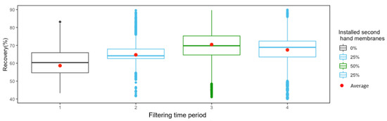The % recovery was statistically assessed during the four operating periods (Figure 5). The median and average recovery are different between the periods, and both are higher when using second-hand membranes. Additionally, the highest values were achieved when 50% of the installed membranes were second-hand membranes.