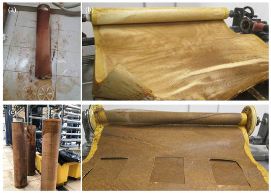 As shown in Figure 6, severe fouling was observed, distributed both outside the fiberglass shell and inside the membrane modules. The M4 and M5 membranes were treated LFL during 10 and 27 months, respectively, at the LFL industrial facility. After dismantling the membrane module, coupons and fouling samples were collected for analysis. Dry membrane fouling weight, TGA and IPC analysis are shown in Table 8. Membrane fouling was more significant in the M5 membrane sample than in M4 one, consistently with the longer operating time. TGA showed that in both cases, most of the fouling was inorganic. ICP analysis revealed that the major common inorganic compounds were: Na, K, Mg, Ca, S, Fe, Al, Sn, Ti.