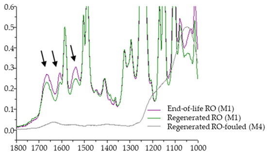 ATR–FTIR spectra for LGSW440 GR membrane end-of-life RO membrane: M1 end-of-life, M1 regenerated and M4 regenerated but fouled after treating LFL (peaks indicated with arrows correspond to the PA signals).