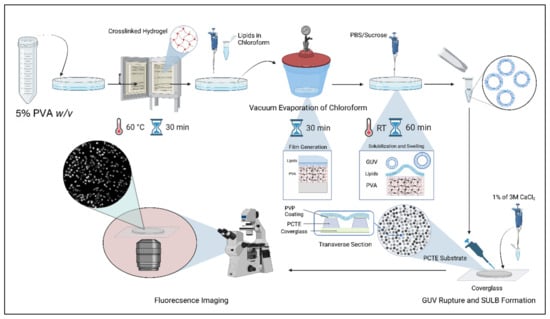 Preparation of suspended lipid bilayer on PCTE substrate. The schematic shows the procedure for SULB platform preparation. GUVs prepared with gel-assisted technique are ruptured and spread over PCTE polymeric substrate placed on a cover-glass.