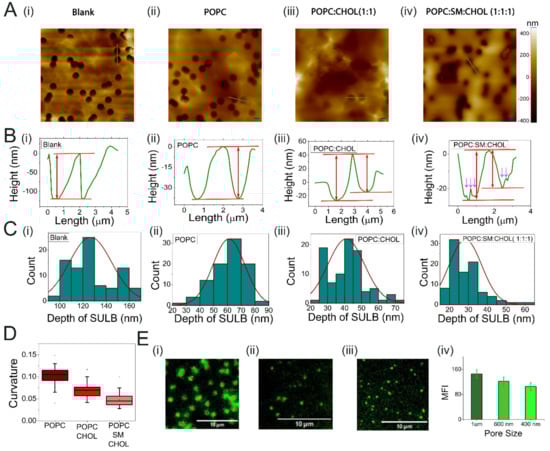 Characterization of SULB system. (A) AFM topographic images, (B) line profiles and (C) the distribution of the depth of the microwells for (i) Blank PCTE substrate, (ii) POPC SULB, (iii) POPC:CHOL (1:1) SULB, and (iv) POPC:SM:CHOL (1:1:1) SULB are shown. Scale bar = 2 μm in panel. The average size of the microwells was found to be 1.2 μm. (A) The arrows in (B(iv)) indicate the surface roughness in ternary Suspended bilayer which may appear due to the Lo/Ld phase separation. (D) Curvature distribution of SULB systems prepared with different lipid compositions. The error bar represents the standard deviation. The total number of cavities, n = 85 for blank, n = 91 for POPC, n = 91 for binary and n = 92 for ternary system are measured. (E) Fluorescence microscopy images of DiI labeled SULB system of microwell size (i) 1 μm, (ii) 600 nm, and (iii) 400 nm. (iv) Mean fluorescence intensity of DiI labeled suspended bilayer for different microwell size. Scale bar = 10 μm.