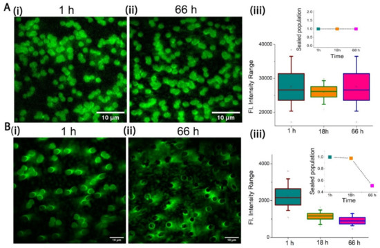 To examine the membrane stability, Sulforhodamine B (SRB) dye was entrapped in the microwells capped by a bilayer allowing the fluorescence imaging of individual cavities. A significant intensity difference between the supported and suspended part of our SULB was observed due to the entrapped dye (Figure 4A and Figure S2C). To measure the stability of the membrane, we imaged the cavities at different intervals of time over 66 h and quantified the fraction of intact microwells based on SRB fluorescence. It is to be noted that for each occasion, we performed multiple gentle washing of the membrane to remove the leaked dye from the ruptured micro wells before imaging. Our SULB membranes on 1 μm microwells was significantly stable as ~100% of the sealed population as well as fluorescence intensity per well was retained up to 66 h (Figure 4A). The narrow range of the SRB intensity distribution also depicted the significant stability of our SULB system. In contrast, we observed significantly reduced stability of 3 μm SULB system as observed as loss of dye by 18 h and final leakage of 50% cavities by 66 h (Figure 4B). The correlation between the stability of the membrane and pore size has been established by various groups and they have shown that higher apertures corresponds to lower stability of the membrane [42,43]. It is also well-known that the substantial reduction in pre-stress of the bilayer membrane results in lowers the membrane rupture frequency [37]. We speculate that due to the bending of the lipid bilayer on the cavity of higher aperture (3 μm), the hydrophilic interactions between the rim surface and bilayer head region weaker than the hydrophobic interaction in the bilayer and this difference in turn can result in the instability of the membranes on larger cavities.