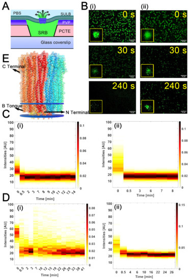 Pore formation in SULB by Cytolysin A. (A) Schematic shows the pore formation and associated SRB dye leakage from the SULB due to protein nanopore formation. (B) Representative fluorescence images of SRB entrapped SULB platform composed of (i) ternary and (ii) binary lipid compositions at different time points upon the addition of 100 nM ClyA are shown. (C) Heat maps of the temporal SRB intensity changes in 600 nm microwell for (i) binary and (ii) ternary membrane systems have been shown. (D) Heat maps of the respective SRB leakage from 1 μm micro-well size for (i) binary and (ii) ternary membrane systems. (E) Membrane embedded dodecameric pore structure of ClyA as obtained from OPM software.