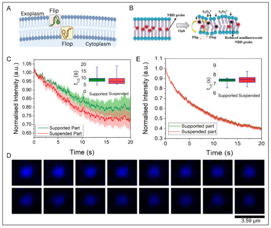 Here, we monitored the spontaneous lipid flip-flop motion in a binary lipid bilayer with the SULB platform after the addition of ClyA. We adapted the sodium dithionite (Na2S2O4) reduction strategy [48,49] with NBD-PC labeled membranes to probe the trans-bilayer movement (Figure 6B). The temporal dynamics were measured by the fluorescence quenching of the NBD probe upon sodium dithionite addition. We measured the time dependent loss of NBD intensity for both supported part and suspended part of our SULB platform in absence and presence of ClyA (Figure 6C–E). The control experiment was carried out on NBD SULB without sodium dithionite to check for the effect of photobleaching. An insignificant change in NBD Fluorescence signal with time that eludes the effect of photobleaching was observed (Figure S6). We found considerable difference in reduction kinetics of NBD fluorescence in supported and suspended part (Figure 6C, inset). This result further suggests the restricted lateral mobility in the supported part also restricts the trans-bilayer movement. NBD reduction rate on the SULB is significantly enhanced upon ClyA addition (Figure 6E). We observed that the half-life of the reduction for the suspended part in absence of ClyA was estimated to be 0.2 min by fitting the decay curve to a single-exponential function (Figure 6E, inset). The value was found to be higher than the reported value (ca. 0.1 min) at an identical dithionite concentration [48]. This discrepancy can be attributed to the presence of high cholesterol concentration, which presumably decreases the effective concentration of the S2O42− ions on the membrane surface due to the increased stiffness of the bilayer. Interestingly, a significantly elevated reduction rate after addition of ClyA was observed indicating an enhancement in trans-bilayer dynamics in the SULB (Figure 6D,E, inset). It is to be noted that after the addition of ClyA, the boundary between kinetic traces of supported and suspended part was diminished (Figure 6E) further inferring a plausible ClyA driven lipid mixing in SULB system.
