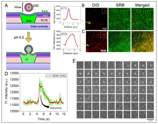 The dengue virus enters the cell by receptor-mediated endocytosis followed by fusion within the cell compartment triggered by mild acidic pH within the lumen of the endosome [50]. In the convex surface of the cells, the virus binds to the clathrin-coated pits where the virions roll over, and subsequently, the clathrin-coated pits invaginate the plasma membrane, which is transported away from the plasma membrane and the pit are released [51]. For this, our suspended lipid bilayer membrane system would be an ideal platform to study the release of the content inside. The concave curvature of the suspended bilayer is similar to an endosome, providing an excellent model for studying viral membrane fusion kinetics. To test the viral membrane fusion, we first generated and purified DENV. We verified them by immunocytochemistry with anti-envelope antibody and the negative TEM imaging (Figure S7). The DENV membrane fusion was followed by introducing a lipid binding dye, DiD into the viral envelope [52]. Earlier reports suggested that DiD spontaneously inserts into the lipid bilayer in self-quenching concentrations, upon membrane fusion, the diffusion and dilution of DiD in the target membrane would result in dequenching of the signal followed by lateral dissipation of the fluorescence [52]. To monitor the DENV membrane fusion process with physiologically relevant membrane [53], a lipid mixture of POPC:SM:CHOL:POPG of equimolar concentration was used to form GUVs for spreading on SULB on 1 μm microwells. To identify the microwells, SRB dye was entrapped in the suspended bilayer allowing the suspended bilayer and the virus to co-localized in imaging (Figure 7A). As anticipated, there is poor fusion of DiD labeled DENV on SULB at physiological pH (7.5) as virus puncta are largely diffraction limited (Figure 7B). On the other hand, after the addition of acetate buffer (pH 5.5), the DiD diffuses throughout the microwells of the SULB along with an associated efflux of SRB dye from the SULB cavities (Figure 7C).