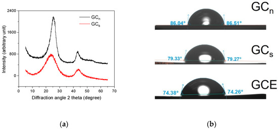 (a) X-ray diffraction (XRD) pattern of natural, GCn, and synthetic glassy carbon, GCs. (b) Photographs illustrating the contact angle for the 3 µL drop of water deposited on the surfaces of GCn, GCs, and commercial glassy carbon electrode, GCE.