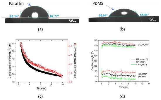 Photographs illustrating the contact angle for (a) paraffin drop and (b) PDMS drop deposited onto a GCs disc. (c) Change in an average contact angle of the PDMS droplet deposited onto the GCn surface and the volume of the PDMS droplet over time. (d) Changes in left, right, and mean contact angles of water droplets deposited onto graphite/paraffin and GCn/PDMS paste.
