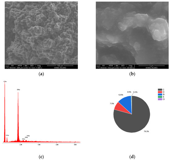 Figure 3a,b show the SEM images of the GCn/PDMS carbon paste. The studies revealed a porous three-dimensional structure of the examined paste that would be beneficial for the accumulation by adsorption of the targeted compounds. At a magnification of 20,000× g, it became apparent (Figure 3b) that fine grains of GCn with a size of approximately 0.2 micrometers have a large share in the paste composition. The large proportion of small grain sizes and lack of agglomeration have a positive effect on the surface development of the electrode material. The EDS analysis of the GCn/PDMS paste indicated, in addition to the main elements C, Si, and O, a trace amount of S and Cl (Figure 3c,d).