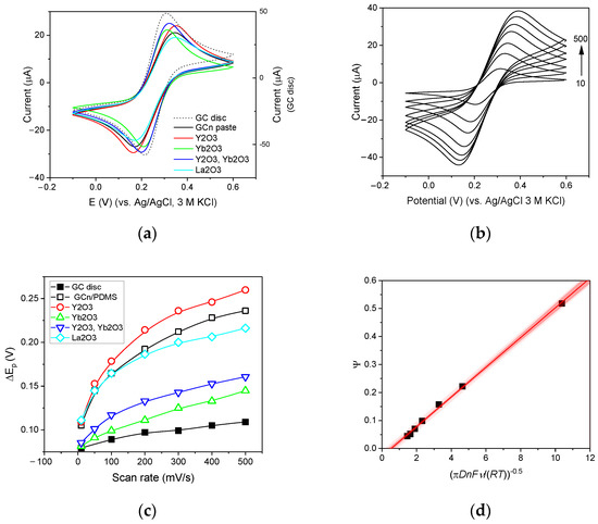 (a) Cyclic voltammograms of 0.005 M K3[Fe(CN)6] recorded in 1 M Na2SO4 by a GC disc electrode, an unmodified paste electrode GCn/PDMS, and GCn/PDMS paste electrodes modified with oxide addition at a scan rate of v = 100 mV/s. (b) Cyclic voltammograms of 0.5 mM 0.005 M K3[Fe(CN)6] recorded in 1 M Na2SO4 using a GCn / PDMS paste electrode at scan rates of 10, 50, 100, 200, 300, 400 and 500 mV/s. (c) The peak-to-peak separation ΔEp measured for K3[Fe(CN)6] voltammograms recorded by the GC disc electrode, the unmodified GCn/PDMS paste electrode and GCn/PDMS paste electrodes modified by oxide addition. (d) Plot of Ψ vs. [πDnFv/RT]−0.5 was prepared using data provided in Figure 4b K3[Fe(CN)6].