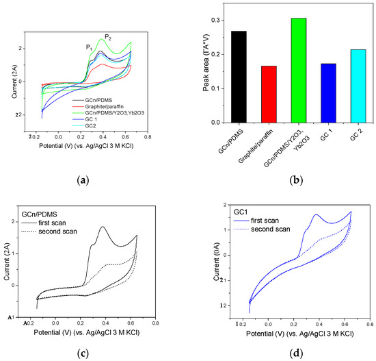 (a) Cyclic voltammograms recorded in 5 µM solution of epigallocatechin using paste (GCn/PDMS, graphite/paraffin, GCn/PDMS modified by Y2O3, Yb2O3) and glassy carbon disk (2 mm in diameter, two batches: GC 1 and GC 2) electrodes. (b) The area of peaks P1 and P2 shown in Figure 7a. (c,d) Two subsequent cyclic voltammograms recorded in 5 µM solution of epigallocatechin gallate using (c) GCn/PDMS and (d) GC 1 electrodes. Supporting electrolyte: 0.1 M acetate buffer, pH = 4.5. Scan rate 50 mV/s.