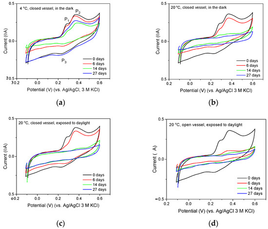 Cyclic voltammograms recorded in 20 times diluted green tea extracts (GT1) stored at (a) 4 °C or (b–d) 20 °C, in (a–c) sealed or (d) opened vessels, (c,d) exposed to daylight, or (a,b) kept in the dark. CVs recorded using GCn/PDMS electrode in 0.1 acetate buffer (pH = 4.5) with a scan rate of 50 mV/s.
