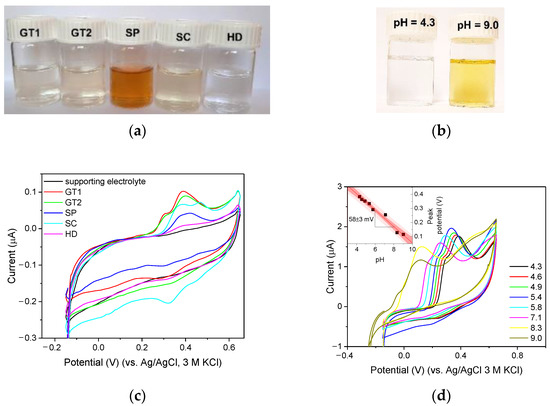 (a) Photograph of the solutions before testing: (GT1, GT2) infusion of Camellia sinensis (two brands) and (SC) Salvia sclarea, (SP) extract of a dietary supplement and (HD) hydrolat. (b) Photograph of the 0.1 mM solution of epigallocatechin gallate with pH 4.3 and 9.0. (c) Cyclic voltammograms recorded in 200 times diluted extracts using GCn/PDMS carbon paste electrodes in 0.1 acetate buffer (pH = 4.5) at a scan rate of 100 mV/s. (d) Cyclic voltammograms recorded in 0.1 mM solution of epigallocatechin gallate in 0.1 acetate buffer of different pH using a GCn/PDMS carbon paste electrode at a scan rate of 50 mV/s. Inset: The dependence of epigallocatechin peak potential on pH.