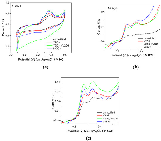 The potential benefits of the application of modified electrodes can be assessed on the basis of the comparison of voltammograms recorded by means of the unmodified and modified GCn/PDMS electrodes in solution containing GT1. Undeniably, the modification of the electrodes brought the benefit in the form of better formed and more intense oxidation peaks (Figure 10a); however, the advantages of the modified electrodes are clearly visible only in long-stored solutions, for example, 14 days, when the concentration of the tested compounds is very low (Figure 10b) or in diluted freshly prepared solutions (Figure 10c).