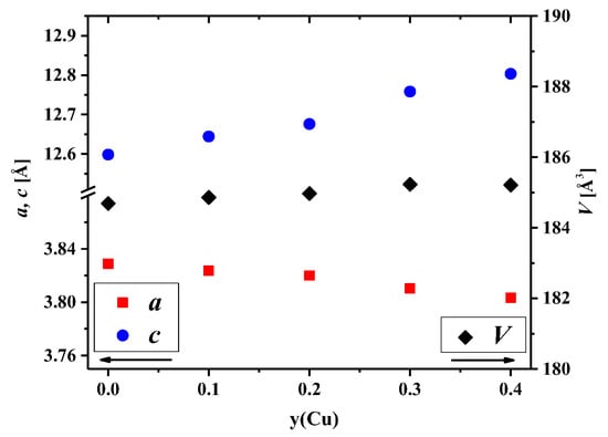 Analysis of the concentration dependencies for the unit cell parameters and volumes presented in Figure 2 showed an increase in the c parameter and the unit cell volume. This was due to the difference in the ionic radii between nickel and copper cations [54]. However, the a parameter slightly decreased with an increase in the copper content. Similar behavior of the concentration dependencies of the unit cell parameters was observed earlier for La2Ni1−yCuyO4+δ [32,33], La1.7Ca0.3Ni1−yCuyO4+δ [37,45,46], Nd2Ni1−yCuyO4+δ [55], Nd1.8Sr0.2Ni1−yCuyO4+δ [56], Nd1.6Ca0.4Ni1−yCuyO4+δ [57], and Pr1.7Sr0.3Ni1−yCuyO4+δ [58].