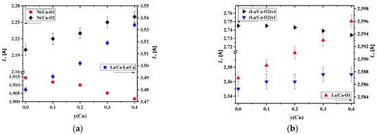 Interatomic distances in the La1.7Ca0.3Ni1−yCuyO4+δ series in dependence on the Cu content: (a) Ni/Cu–O, and (b) La/Ca–La/Ca, La/Ca–O.