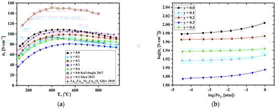 Dependencies of the total conductivity of the La1.7Ca0.3Ni1−yCuyO4+δ ceramics on: (a) on temperature, and (b) on pO2 [35,37].
