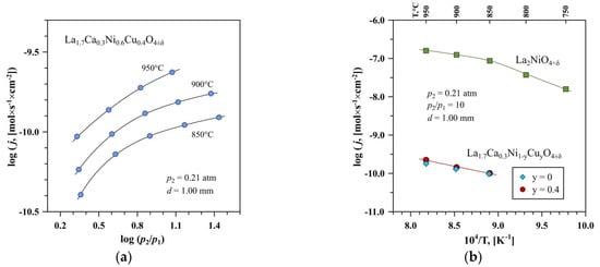 (a) Dependencies of the oxygen permeation fluxes through the La1.7Ca0.3Ni0.6Cu0.4O4+δ ceramic membrane on the pO2 gradient at 850–950 °C, and (b) Temperature dependences of the oxygen permeation fluxes through the La1.7Ca0.3Ni0.6Cu0.4O4+δ and La1.7Ca0.3NiO4+δ membranes under the fixed pO2 gradient. The data on the undoped La2NiO4+δ sample are taken from [65].