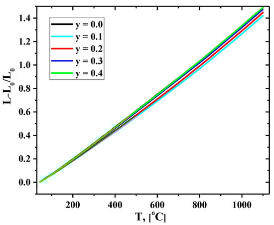 Dilatometry experiments were performed both in heating and cooling modes. As an example, the temperature dependencies of the linear expansion of the La1.7Ca0.3Ni1−yCuyO4+δ compact samples collected in air during heating are shown in Figure 6. Based on the obtained experimental data, the averaged values of the La1.7Ca0.3Ni1−yCuyO4+δ linear thermal expansion coefficients (TECs) in the studied temperature range of 40–1100 °C were calculated and compared with the data presented in the literature (Table 4).