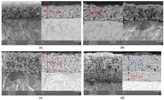 SEM images of the cross-sections of the La1.7Ca0.3Ni1−yCuyO4+δ/SDC assemblies (Ts = 1000 °C): (a) single-layer electrode y = 0.0; (b) single-layer electrode y = 0.2; (c) single-layer electrode y = 0.4; (d) two-layer electrode y = 0.4 (Ts = 900 °C) with the LNF collector layer (50 μm, Ts = 900 °C). The thickness of the La1.7Ca0.3Ni1−yCuyO4+δ functional layers is shown in red, the thickness of the LNF collector is shown in blue.