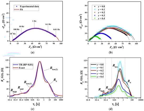 The influence of the sintering temperature of the electrode layers on the polarization characteristics was evaluated in preliminary electrochemical experiments (Figure S11). It can be seen that the optimal sintering temperature decreases with Cu substitution by 300 °C for the sample with y = 0.4 (900 °C) compared to the copper-free La1.7Ca0.3NiO4+δ electrode (1200 °C). The preliminary studies also revealed that the polarization resistance of the copper-substituted La1.7Ca0.3Ni0.6Cu0.4O4+δ electrodes was lower than that of the parent material. To elucidate the impact of Cu substitution, a comprehensive analysis of the EIS data was performed. The impedance spectra for the La1.7Ca0.3Ni1−yCuyO4+δ/SDC symmetrical cells (TS = 1000 °C) collected at 600 °C are shown in Figure 8a,b. The complex shape of the spectrum in Figure 8a indicates the presence of several contributions to the overall polarization resistance (Rp). A comparison of the impedance plots measured at 600 °C in Figure 8b demonstrates that the polarization resistance of the studied cells significantly decreases when y ≥ 0.3.