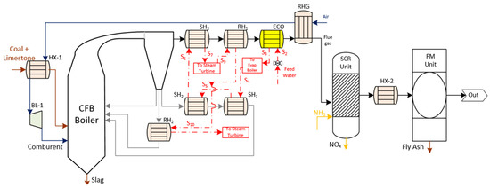 The Reference Case 863 MWel,gross CFB boiler (Figure 1) was characterized by the combustion of anthracite coal with air through a circulating fluidized bed that is formed of sand, limestone, coal, and combustion waste. CFB boilers allow the reduction of the temperature with a higher combustion time, thus achieving a higher stabilization of the temperature in the combustion zone and lower formation of NOx. Additionally, this type of boiler has great versatility in its fuels, admitting impurities, and higher particle size distribution. Thanks to the introduction of limestone in the bed, the flue gas shows lower SOx concentration because desulphurization occurs in the boiler.