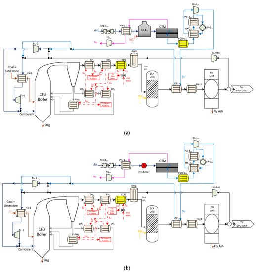 Cases 4 and 5 are displayed in Figure 4. As can be seen, these cases maintained certain similarities with previous OTM units in terms of equipment of the oxy-combustion area, steam cycle and gas treatment system.