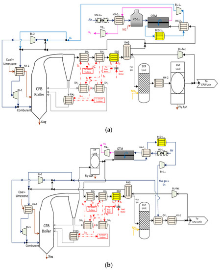 Figure 3a displays the schematic diagram of an oxygen-fired CFB process comprising an OTM unit. In this case, the oxy-combustion area, steam cycle, and pollutant control system (SO2, NOx, and particles) maintains the same design as Case 1. Concerning the OTM unit, this case was characterized by having driven equipment, a combustion chamber, and heat exchangers. Firstly, the air feed stream was compressed by a multi-compressor (MC-1m) to provide high pressure on the feed side of the OTM membrane. After that, this stream passed through the heater HX-1m and the combustion chamber (CC-1m). In the first heat exchanger, the retentate stream of the OTM membrane was responsible for giving up the heat to the air stream. Immediately, the combustion of natural gas in the combustion chamber provided the rest of the heat for the air, satisfying the required operating temperature during the air separation. This work used the same specification as done in Portillo et al. [2].