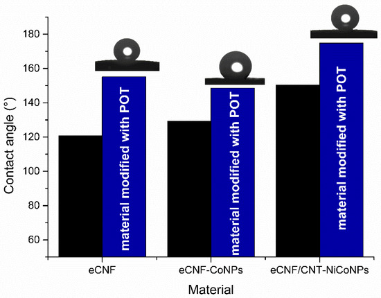 The modification of the material increased its hydrophobicity by 34° in the case of eCNF+POT (155°), 19° in the case of eCNF-Co3+POT (149°) and 24° in the case of eCNF/CNT-NiCo (175°). All obtained values are higher than those published for the sensors based on the mixture of carbon nanotubes and POT in paper-based sensors [13]. All tested materials were characterized by high hydrophobicity, which is favorable for their proposed use as an intermediate layer in solid-contact electrodes.