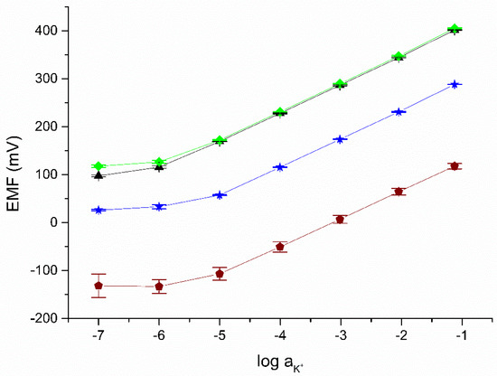 The tested electrodes show good potential reversibility (Figure 5). The value of the standard deviation for the potential recorded in a solution with a concentration of 10−2 M KCl is 0.2 mV for eCNF+POT/K+-ISM, 0.3 mV for eCNF-Co+POT/K+-ISM and 0.3 mV for eCNF/CNT-NiCo+POT/K+-ISM. The electrodes were characterized by a much better reversibility of the potential than the one obtained for the coated disc electrode, for which the standard deviation of the response in this solution was 0.7 mV.