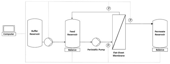 Experimental setup of the diafiltration process with continuous buffer addition to the feed reservoir. The pump was coupled to the balance of the feed reservoir and was controlled using LabVision software [37].