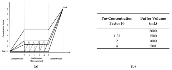 Experimental procedure for the five UF/DF processes. (a) Variation of the tested process and (b) buffer consumption for the diafiltration processes with respect to the pre-concentration factors. Solid line = continuous diafiltration. Dotted line = discontinuous diafiltration [37].