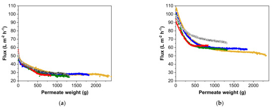 Flux decline in relation to different pre-concentration factors for MV in (a) SCM and (b) SFM. For continuous diafiltration, the data represent pre-concentration factors of 1 (yellow), 1.33 (blue), 2 (green) and 4 (red). For discontinuous diafiltration, the pre-concentration factor of 2 is represented by open diamonds [37].