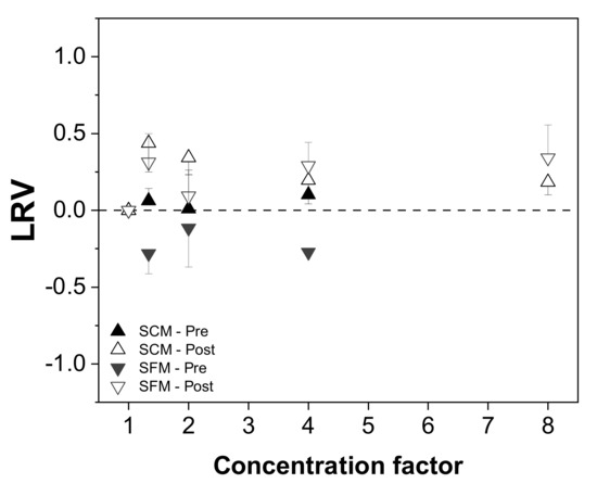 Relationship between the infectious virus titer and process concentration mode (before or after diafiltration) in serum-containing and serum-free media. The change in the total infectious virus titer is expressed as a log reduction value (LRV) [37].