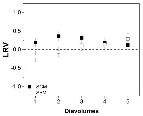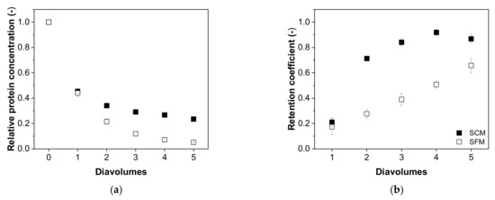 For the total protein content, the differences between SCM and SFM were not as conspicuous as those observed for hcDNA. The depletion of total protein in SCM (0.24 ± 0.01 after five diavolumes) was only slightly less efficient than the comparable process in SFM (0.05 ± 0.01) and the curves were otherwise similar (Figure 8a). Furthermore, the retention coefficient started at similar values in both media (0.21 ± 0.04 in SCM and 0.17 ± 0.06 in SFM) and also ended with similar values (0.87 ± 0.03 in SCM and 0.66 ± 0.06 in SFM) after five diavolumes, although the increase in SFM was linear, whereas that in SCM was parabolic, increasing for the second diavolume to 0.71 ± 0.01 (Figure 8b).