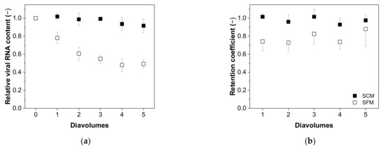 The relationship between the relative virus RNA content and number of diavolumes is shown in Figure 6a. For the MV in SCM, we observed no significant decrease as the number of diavolumes increased from 0 to 5 (0.92 ± 0.08, n = 5). In contrast, for the MV in SFM we observed a significant reduction and non-dependence after two diavolumes (two diavolumes = 0.61 ± 0.07; five diavolumes = 0.49 ± 0.04, n = 5). This trend was also evident for the retention coefficient, indicating the lower retention of MV particles in SFM compared to SCM, perhaps as a consequence of membrane fouling (Figure 6b).