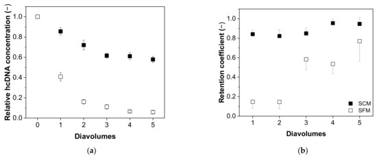The correlation between the number of diavolumes and (a) the relative concentration of hcDNA and (b) the retention coefficient for hcDNA during the purification of MV by UF/DF. Data are means ± SEM (n = 5) [37].