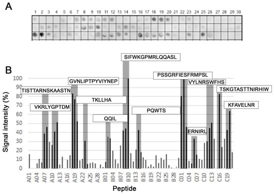 The epitopes of the PS protein from A. cantonensis recognized by patients sera were mapped using the parallel Spot-synthesis strategy. The peptide library consisted of 69 peptide sequences of 15 amino acids that overlapped by 10 amino acids and covered the entire protein sequence. A representative experiment is presented in Figure 1. The list of synthesized peptides is shown in Supplementary Figure S1. Overall, each epitope displayed a relatively strong reactivity (containing 4–15 residues of extension). However, the most vigorous intensity was observed with the antigenic determinant in the peptide SIFWKGPMRLQQASL (B10) and PSSGRFIESFRMPSL (C2).