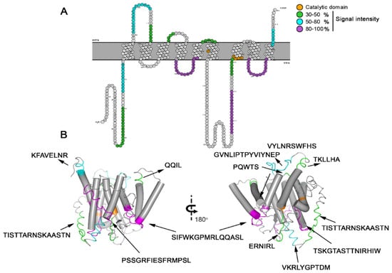 Model of Ag/PS as a multi-pass transmembrane protein (TM), based on the predictive results obtained by bioinformatics (available online: https://topcons.net/pred accessed on 12 November 2020) and layout generated using Protter (available online: http://wlab.ethz.ch/protter/ accessed on 15 November 2020). The 9 TM domains reveal 12 identified epitopes and the catalytic pocket (orange) with the typical motifs XD (TMD6) and GLGD (TMD7) but the absence of the PALP domain (A). Three-dimensional structure and membrane-spanning model of A. cantonensis presenilin protein. 3D protein conformation and structure were determined using the I-Tasser, and epitopes were highlighted (purple), indicating the position of the 12 linear B epitopes identified by Spot-synthesis ((B), Table 1).