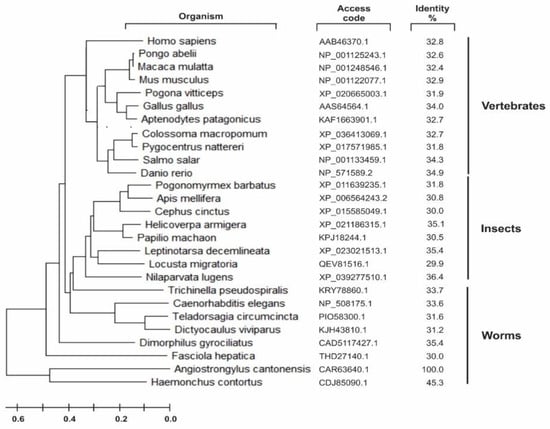 A group of sequences for PSs was retrieved on the Uniprot server (Available online: http://www.uniprot.org accessed on 23 August 2020) through a search using the criteria name, “PS,” and a length of 300 to 800. A phylogenetic tree was created with the sequences aligned by the neighbor-joining algorithm using a CLUSTALW program (Figure 4). The A. cantonensis aspartyl protease was localized in a separate subgroup along with the Haemonchus contortus enzyme detached from the other worm’s subclasses of this protease family, such as Fasciola hepatica and Caenorhabditis elegans.