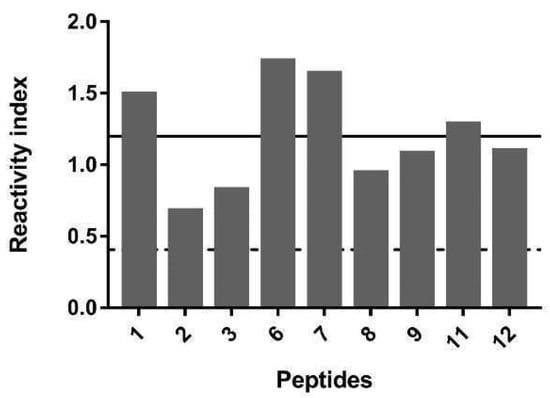 Then, to confirm the immunogenicity of the epitopes, nine single peptides were synthesized (Table 1) and individually evaluated by ELISA assay using serum from infected rats. The results (media ± SD) are shown in Figure 5 and show that all the epitopes were highly reactive.